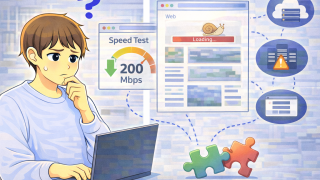 回線速度(Mbps)は十分なのにWebページ表示が遅い原因を解説。DNS応答、Pingやジッター、Wi-Fiのパケットロス、端末性能、サイト側負荷まで、表示が遅く感じる理由と切り分け手順をわかりやすくまとめました。